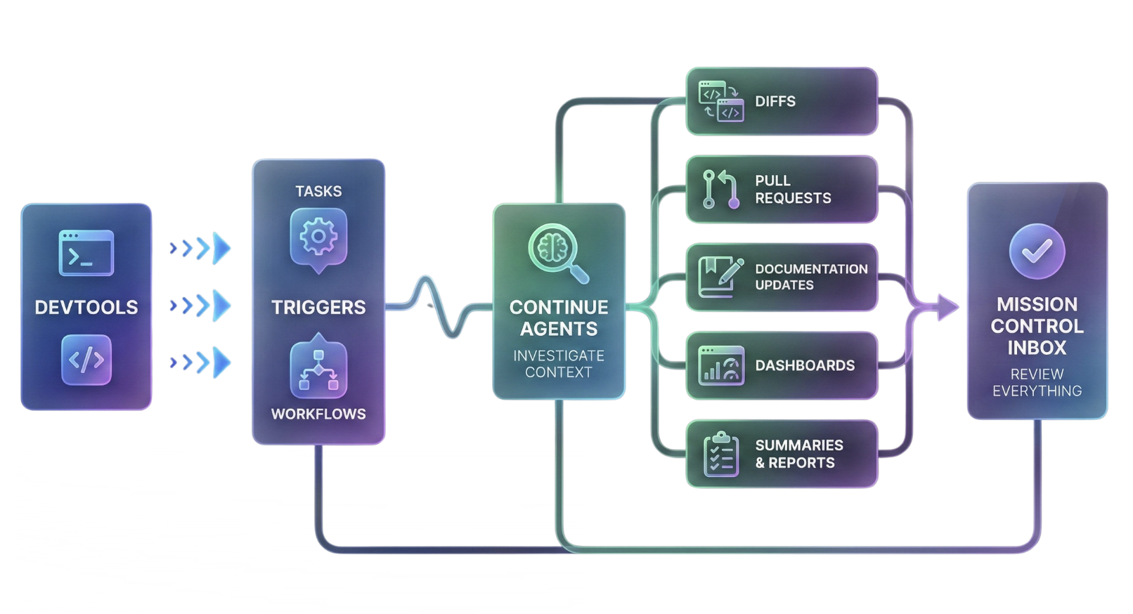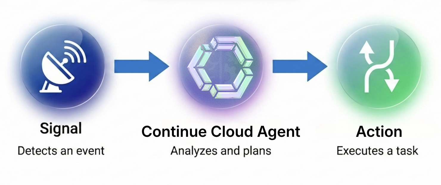 By connecting your existing toolchain (GitHub, Sentry, Snyk, Supabase, PostHog, Slack, Netlify, etc.) to Continue Mission Control, you can deploy AI Agents that turn noisy signals into finished work.