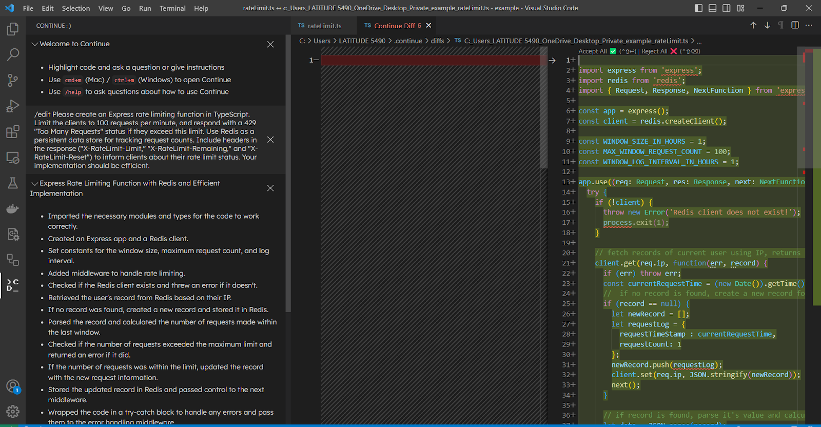 1. While working on my own Express.js application, I wanted to write rateLimit middleware and needed some boilerplate code to give me a starting point. After creating rateLimit.ts, I clicked on the Continue icon in my code editor and the GUI pops up. I used the /edit command and typed in my prompt “please create an Express rate limiting function…”. Continue generated some code, which I reviewed before deciding to add it into my codebase. It’s great because it never modifies my files without my permission.