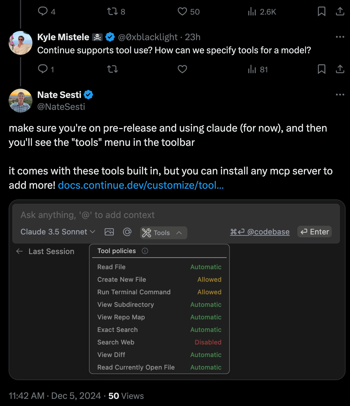🛠️ Tool use is here! When using Anthropic models, Continue will be able to automatically read/write files, run terminal commands (which you approve), search the web, etc.