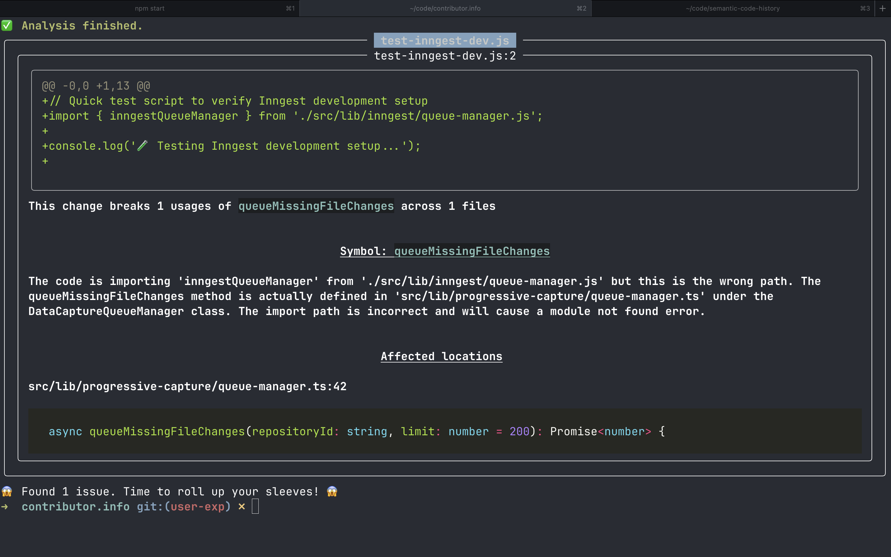 import { inngestQueueManager } from './src/lib/inngest/queue-manager.js';Looks reasonable, right? Wrong. The queueMissingFileChanges method is actually defined in src/lib/progressive-capture/queue-manager.ts under the DatacaptureQueueManager class. The import path was completely hallucinated.