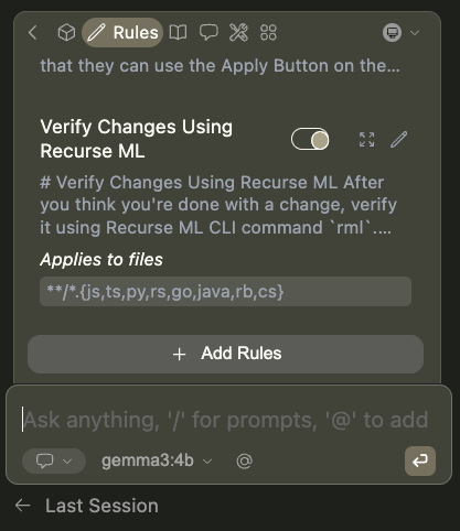 - Quality gate: The "Verify Changes Using Recurse ML" rule in .continue/rules automatically applies when I'm working on .js, .ts, or other files matching the glob pattern, prompting Continue to run verification