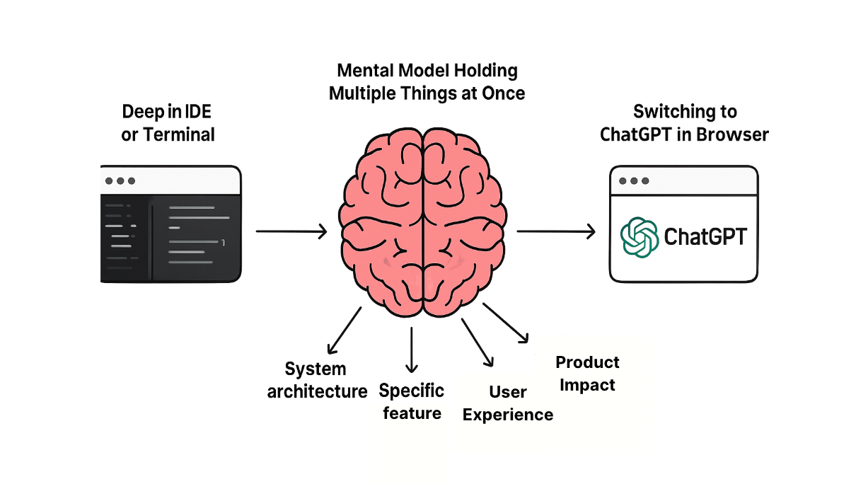When you're deep in your IDE or terminal, working on a complex problem, your brain is holding multiple things at once: the system architecture, the feature you're building, the user experience, and the impact of your decisions on the project. This is all carefully balanced as a mental model when you're focusing. But when you're interrupted, even with something seemingly innocuous like switching to ChatGPT in your browser, your attention is broken and can take on average 23 minutes to get back to where you started.
