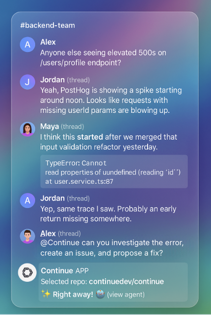 When you connect Slack to Continue, you're you're giving your AI agents access to the full context of your team's conversations. Your team already plans, discovers, debates, and diagnoses problems in Slack.